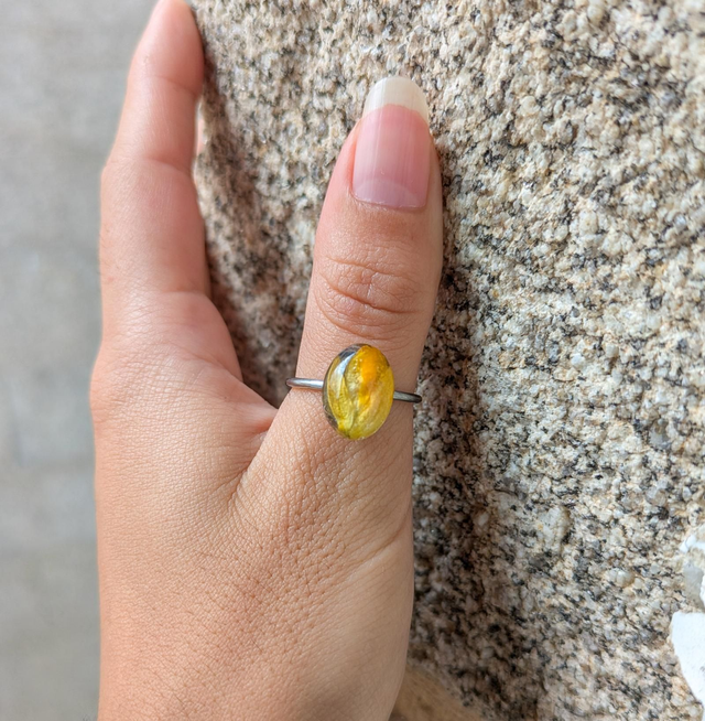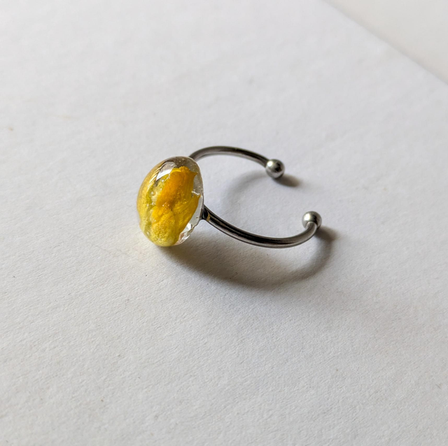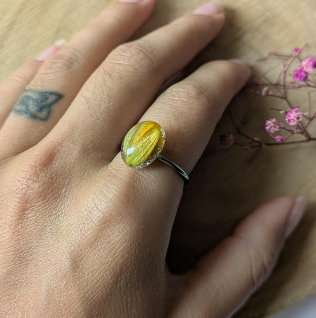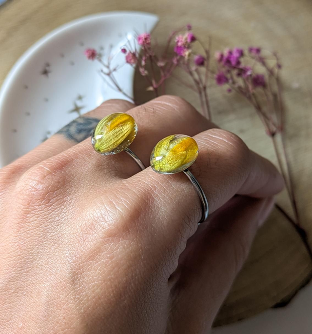 ¿Qué hay más emblemático de Galicia que el toxo? Con este anillo de resina de la flor de toxo, podrás llevar esta planta siempre contigo. Este anillo es de acero inoxidable ajustable, el diámetro de la pieza central mide unos 10 mm. Está realizado a mano con materiales de alta calidad. Una joya botánica artesanal con toda la esencia de los bosques gallegos que no puede faltar en tu colección.