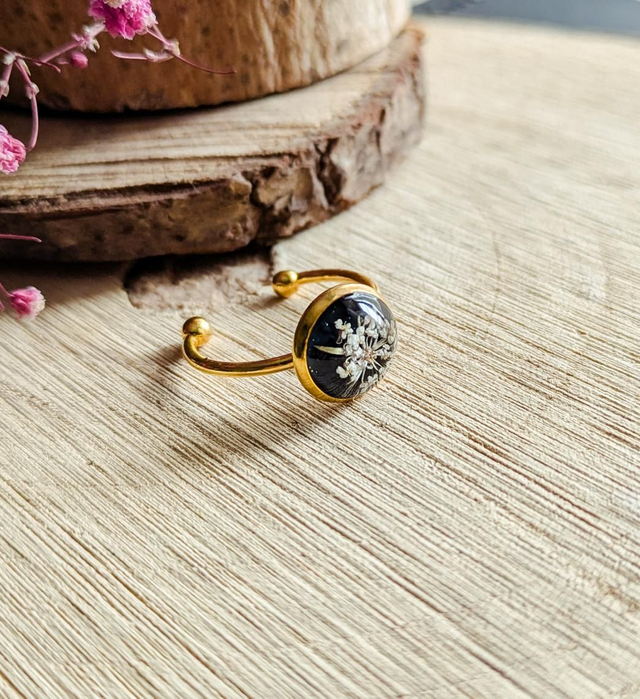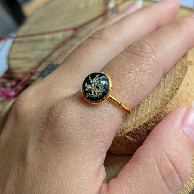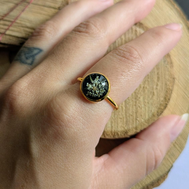 Anillo realizado a mano con la bonita y delicada flor de la zanahoria silvestre sobre fondo negro para que destaque. Regalo ideal para toda amante de la naturaleza con un toque de elegancia.