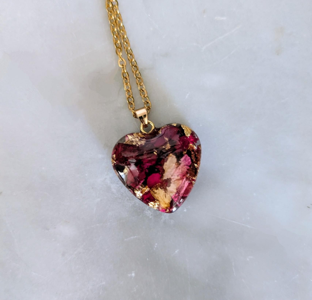 Bonito colgante de corazón realizado a mano con resina, rosas secas reales y foil dorado. Una pieza romántica y delicada.