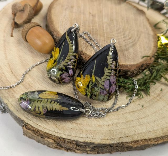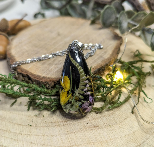 Una maravilla del bosque gallego, este colgante de resina lleva encapsuladas varios de tipos de flores y plantas naturales. En él encuentras lo mismo que dando un paseo por cualquier monte: helechos, líquenes, toxo y brezo. Todo ello sobre un fondo negro que hace que destaquen. Es perfecto para los amantes de la naturaleza y los que aprecian la auténtica joyería inspirada en la naturaleza de Galicia. Hecho a mano con dedicación, ¡es una opción de regalo ideal!