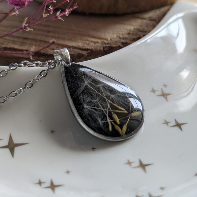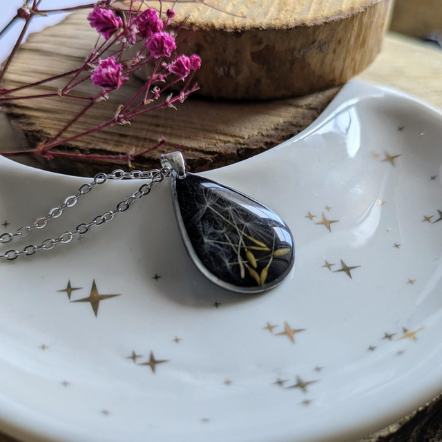 Colgante artesanal con semillas de diente de león encapsuladas en resina negra de acabado brillante. Su forma de lágrima resalta la delicadeza de cada semilla, evocando deseos atrapados en una joya. Montado en cadena y marco de acero inoxidable hipoalergénico, es ligero, duradero y único: una pieza perfecta para llevar siempre un pedacito de naturaleza contigo.