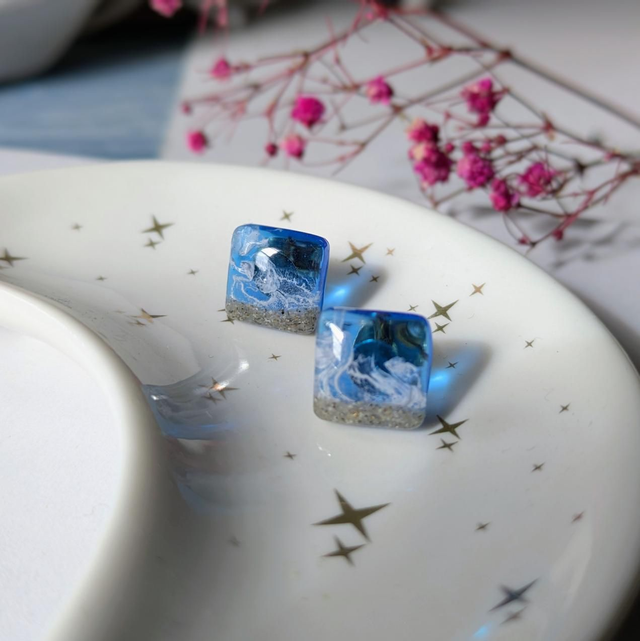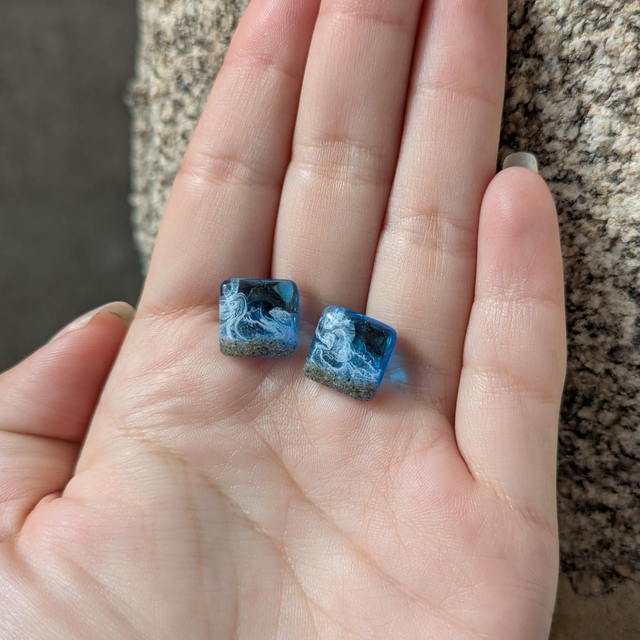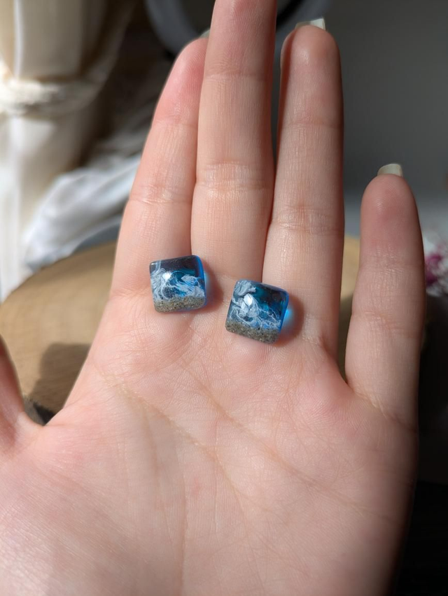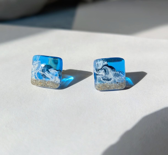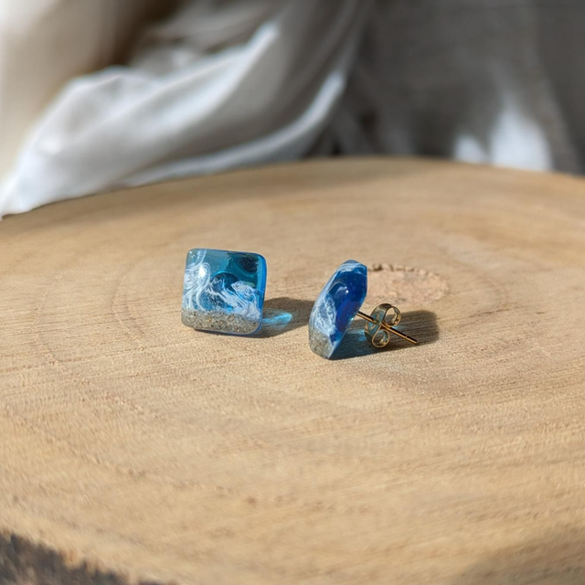 Preciosos pendientes de botón marinos artesanales con arena real y las olas. Ideales para dar un toque playero a cualquier atuendo o para los amantes del mar y la playa.