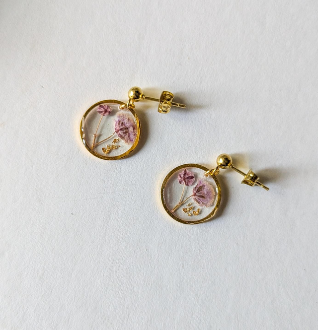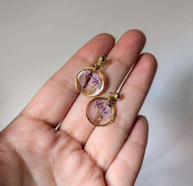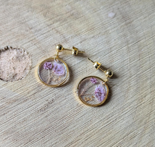 Pendientes redondos con gypsophila encapsulada en un bisel de latón dorado. Sencillos y ligeros, ideales para diario.